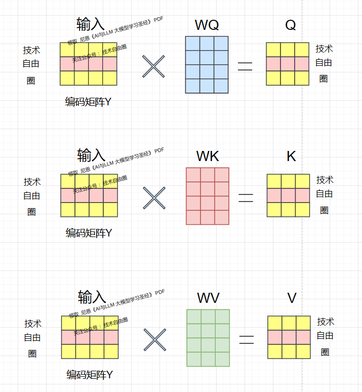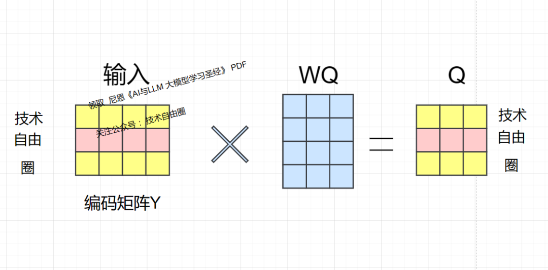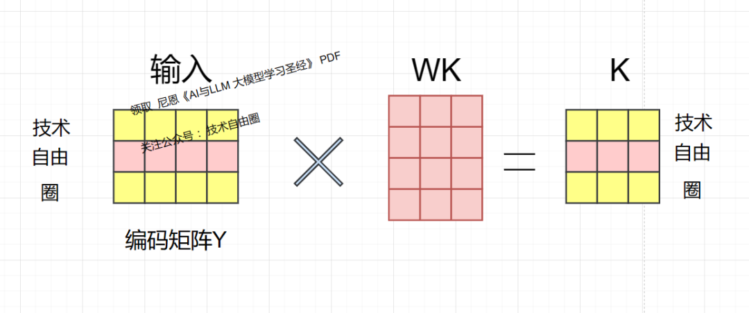 技术自由圈的编码矩阵Y,和线性变换矩阵WK 相乘,得到key键向量矩阵 K,K的每一行都表示一个分词。