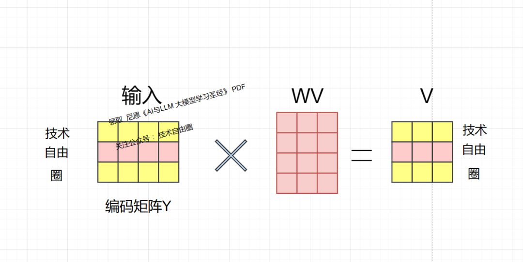 技术自由圈的编码矩阵Y,和线性变换矩阵WK 相乘,得到value值向量矩阵V,V的每一行都表示一个分词。