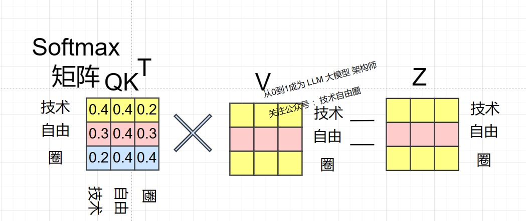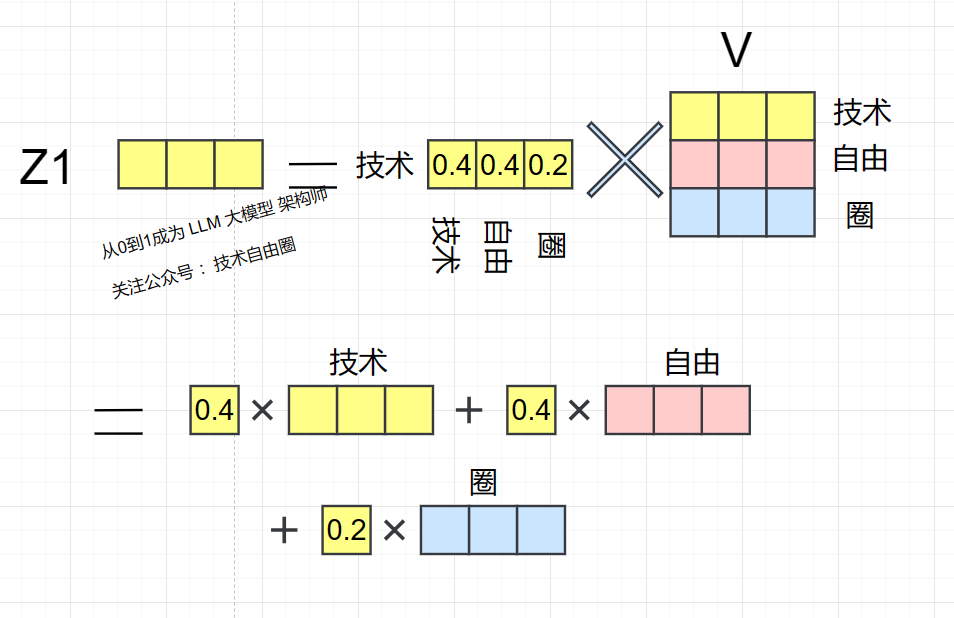 上图中 Softmax 矩阵就是 attention 系数 矩阵, attention 注意力系数矩阵 的每一行,含义如下: 第 1 行表示分词 1 技术 与其他所有分词的 attention 系数, 第 2 行表示分词 2 自由 与其他所有分词的 attention 系数, 第 3 行表示分词 圈 自由 与其他所有分词的 attention 系数, 到这里,我们彻底理解了线性代数里边的矩阵的相乘, 就是各个纬度的相关行计算。 之前尼恩在学习线性代数的时候,也是不知道的矩阵相差有什么用,纯粹为了学习线性代数,而去学习线性代数 直到尼恩在讲 第 35章netty的对象池、内存池视频的时候,才知道大学里边学习的满二叉树,原来是可以用到 内存池的 buddy算法里边, omg,大学老师,为啥不讲讲这个。 同样,如果是一个矩阵是一个user的偏好向量矩阵, 比如一个shape(5,10)维的矩阵,可以认为是这个用户有5个偏好,以及每个偏好的向量表示,向量相乘就是各个偏好的相关性。 softmax 之后,得到的数之和就是1 ,这样代表了每一个偏好权重。这就是 attention的核心 加权求和 的由来。 根据上面的注意力矩阵,当关注"技术"这个字的时候,