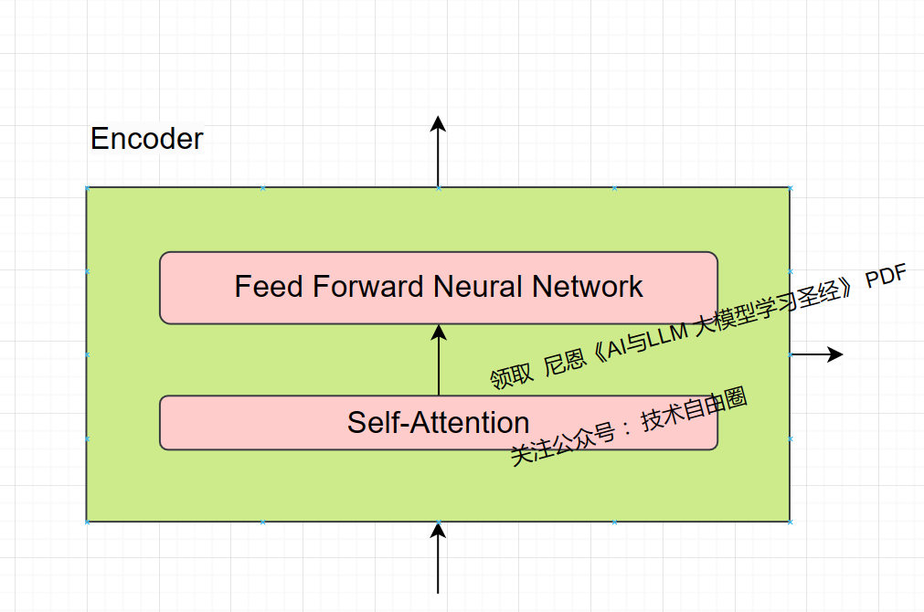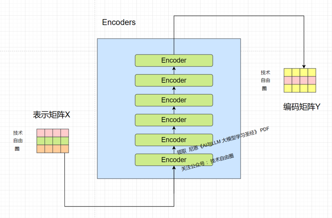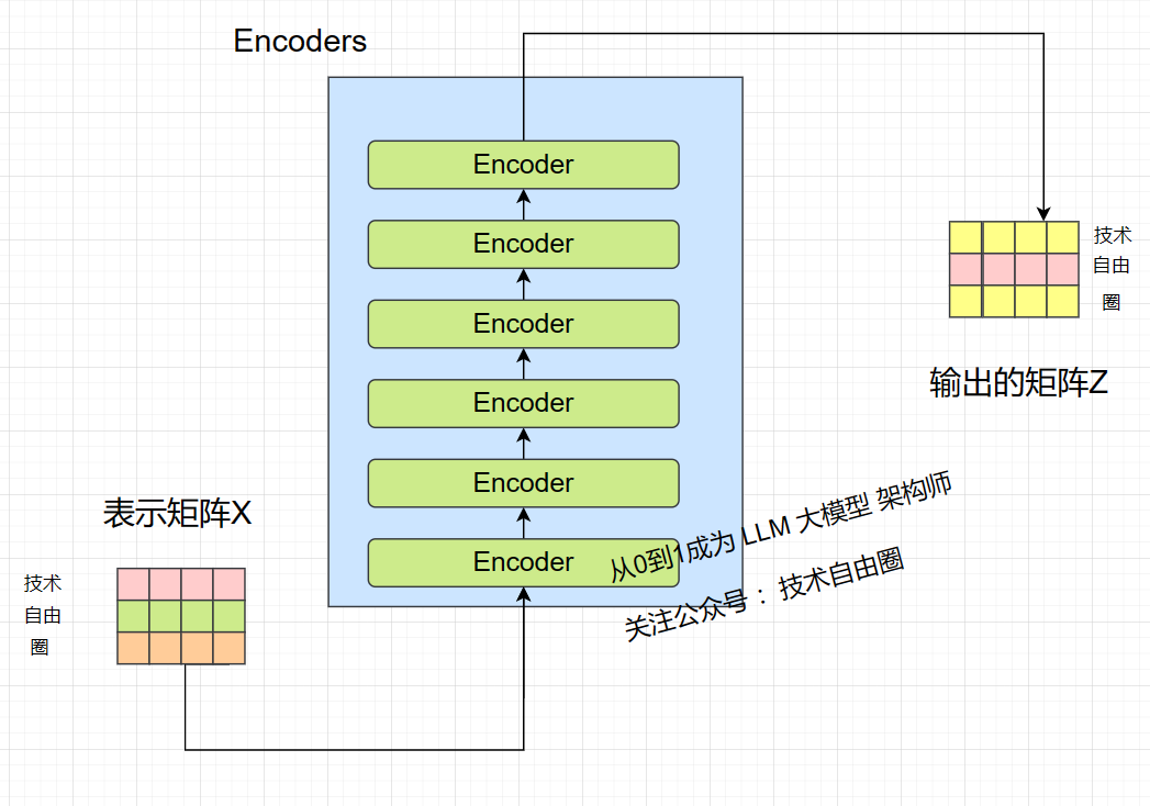 40岁老架构师尼恩提示:大模型比较难,功力浅的不容易懂。 这部分内容如果不懂,可以稍后去学习技术自由圈社群对应的配套视频《从0到1穿透LLM大模型架构》,具体请参见尼恩的公号,技术自由圈 Encoder的结构,以“技术自由圈”的翻译为例 通过上面描述的 Multi-Head Attention, Feed Forward, Add & Norm 就可以构造出一个 Encoder block, Encoder block 接收输入矩阵 X(3×4) ,并输出一个矩阵 Z(3×4) 。