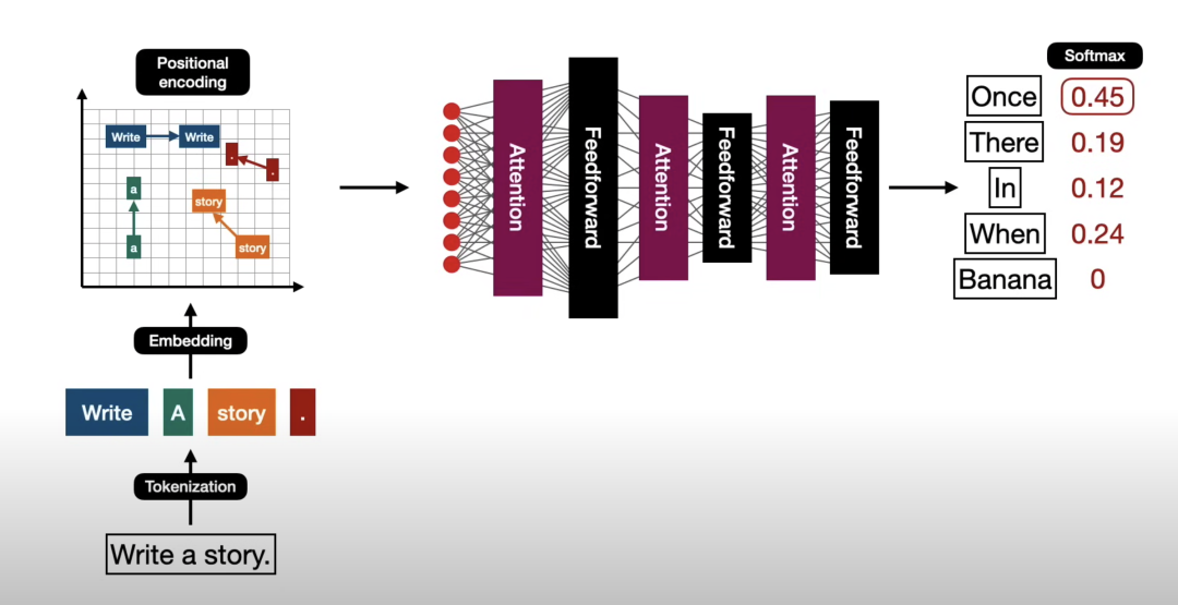 尼恩啰嗦一下,无论原文本还是目标文本,都包含两个编码向量矩阵: 分词的 Embedding(Embedding就是从原始数据提取出来的Feature) 分词位置 Embedding (位置 Feature)相加得到。 Input Embedding(输入嵌入层)要点: 在Transformer模型中,每时每刻的输入都是input embedding + positional encoding,即所带有的信息加上其位置编码,其中embedding就是用来取代传统RNN(如seq2seq)中的hidden states。 由于transformer模型属于自回归模型,因此它的下一个输出需要基于上一个输出进行推断,即主框架中的outputs(shifted right) position encoding是位置编码,是不可以缺失的一部分,它可以将attention计算方式无法捕捉的位置信息变成embedding形式,直接叠加到变换为embedding形式后的input中。 因为在解码的时候,仅知道当前词左边的部分。由此,利用masking(当前词右侧的内容被设置为−∞,这样softmax的值为0)屏蔽了当前词右边部分的影响,保持了自回归的特性。 40岁老架构师尼恩提示:大模型比较难,功力浅的不容易懂。 这部分内容如果不懂,可以稍后去学习技术自由圈社群对应的配套视频《从0到1穿透LLM大模型架构》,具体请参见尼恩的公号,技术自由圈 输出部分包含: