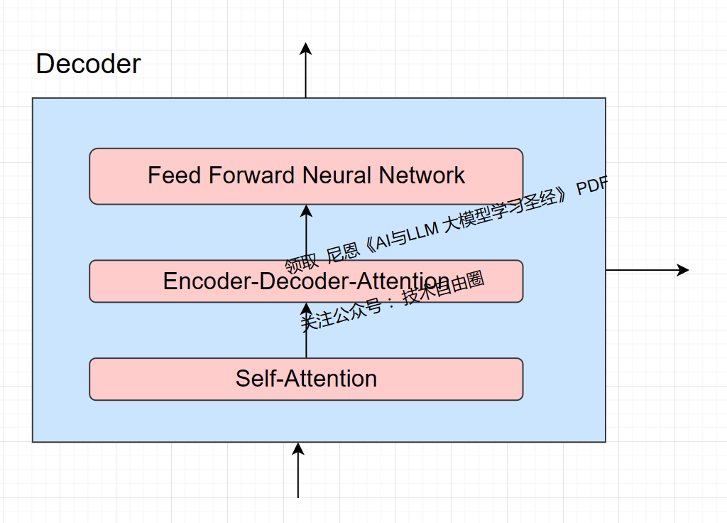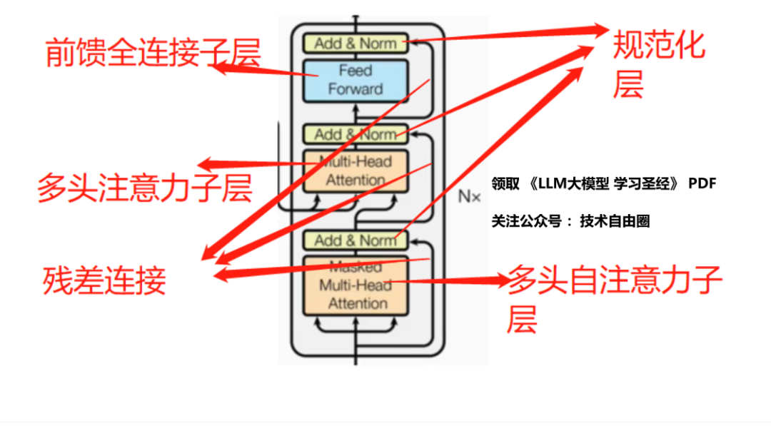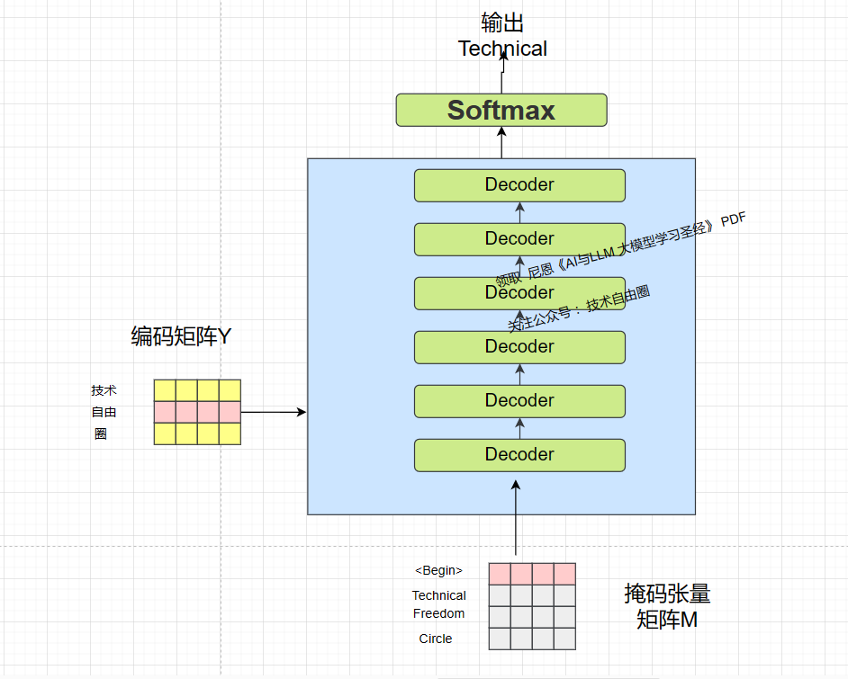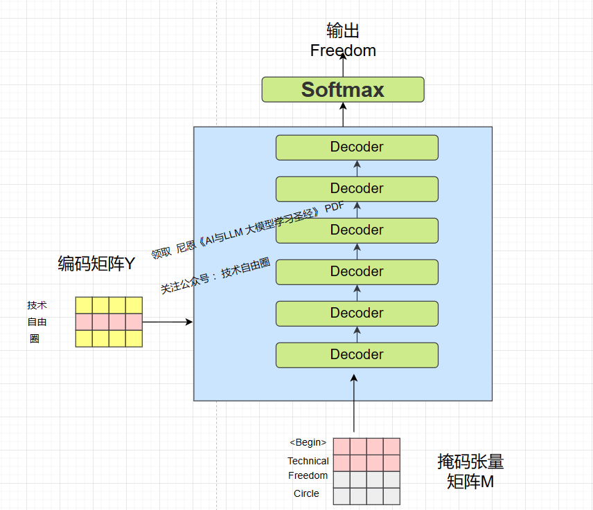 第一个 Encoder block 的输入为句子分词的表示向量矩阵,后续 Encoder block 的输入是前一个 Encoder block 的输出,最后一个 Encoder block 输出的矩阵就是编码信息矩阵 Z ,这一矩阵后续会用到 Decoder 中。 40岁老架构师尼恩提示:大模型比较难,功力浅的不容易懂。 这部分内容如果不懂,可以稍后去学习技术自由圈社群对应的配套视频《从0到1穿透LLM大模型架构》,具体请参见尼恩的公号,技术自由圈 Decoder 解码器结构,以“技术自由圈”的翻译为例 这部分详细内容略,请参见 尼恩的 PDF版本 《LLM大模型学习圣经:从0到1吃透Transformer技术底座》 第一个 Multi-Head Attention 这部分详细内容略,请参见 尼恩的 PDF版本 《LLM大模型学习圣经:从0到1吃透Transformer技术底座》 第二个 Multi-Head Attention 这部分详细内容略,请参见 尼恩的 PDF版本 《LLM大模型学习圣经:从0到1吃透Transformer技术底座》 Softmax 预测输出分词 这部分详细内容略,请参见 尼恩的 PDF版本 《LLM大模型学习圣经:从0到1吃透Transformer技术底座》 Transformer 总结 这部分详细内容略,请参见 尼恩的 PDF版本 《LLM大模型学习圣经:从0到1吃透Transformer技术底座》 参考文献: 论文:Attention Is All You Need https://jalammar.github.io/illustrated-transformer/ http://nlp.seas.harvard.edu/annotated-transformer/ https://playground.tensorflow.org 说在最后:有问题找老架构取经 毫无疑问,大模型架构师更有钱途, 这个代表未来的架构。 前面讲到,尼恩指导的那个一个成功案例,是一个9年经验 网易的小伙伴,拿到了一个年薪近80W的大模型架构offer,逆涨50%,那是在去年2023年的 5月。 不到1年,小伙伴也在团队站稳了脚跟,成为了名副其实的大模型架构师。回想当时,尼恩本来是规划指导小伙做通用架构师的( JAVA 架构、K8S云原生架构), 当时候为了他的钱途, 尼恩也是 壮着胆子, 死马当作活马指导他改造为 大模型架构师。 不到1年时间,现在 职业身价翻了1倍多,现在P8级,可以拿到年薪 200W的offer了。 既然有一个这么成功的案例,尼恩能想到的,就是希望能帮助更多的社群小伙伴, 成长为大模型架构师,也去逆天改命。 这一次,尼恩团队用积累了20年的深厚的架构功力,编写一个《LLM大模型学习圣经》,帮助大家进行一次真正的AI架构穿透,帮助大家穿透AI架构。 尼恩团队的大模型《LLM大模型学习圣经》是一个系列,初步的规划包括下面的内容: 《LLM大模型学习圣经:从0到1吃透Transformer技术底座》 《LLM大模型学习圣经:从0到1吃透大模型的基础实操》 《LLM大模型学习圣经:从0到1吃透大模型的顶级架构》 本文是第一篇《LLM大模型学习圣经:从0到1吃透Transformer技术底座》 ,后面的文章,尼恩团队会持续迭代和更新。 并且录制配套视频。 多年来,用深厚的架构功力,把很多复杂的问题做清晰深入的穿透式、起底式的分析,写了大量的技术圣经: Netty 学习圣经:穿透Netty的内存池和对象池(那个超级难,很多人穷其一生都搞不懂), Caffeine学习圣经:比如Caffeine的底层架构, 上面这些学习圣经,大家可以通过《技术自由圈》公众号,找尼恩获取。 大家深入阅读和掌握上面这些学习圣经之后,一定内力猛涨。 另外,如果学好了之后,还是遇到职业难题, 没有面试机会,怎么办? 前段时间,帮助一个40岁+就业困难小伙伴拿到了一个年薪100W 的offer,小伙伴实现了 逆天改命 。 部分历史案例 实现职业转型,极速上岸
