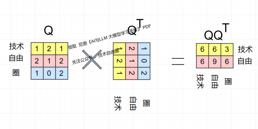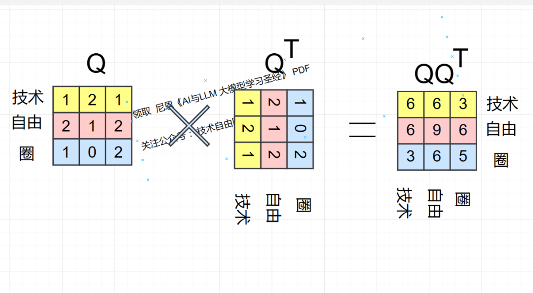 这里,非常重要的是,首先要明白的是 矩阵 与其转置相乘的含义是什么? 简单来说,向量相乘,表示一个向量在另一个向量上的投影。投影越大,说明向量相关性越高。 下面我们模拟一下 Q 乘以QT(Q的转置),看看具体结果的意思 首先得到的,是 技术 和 技术、技术和自由、技术和圈 ,三个分词之间的 相关性: