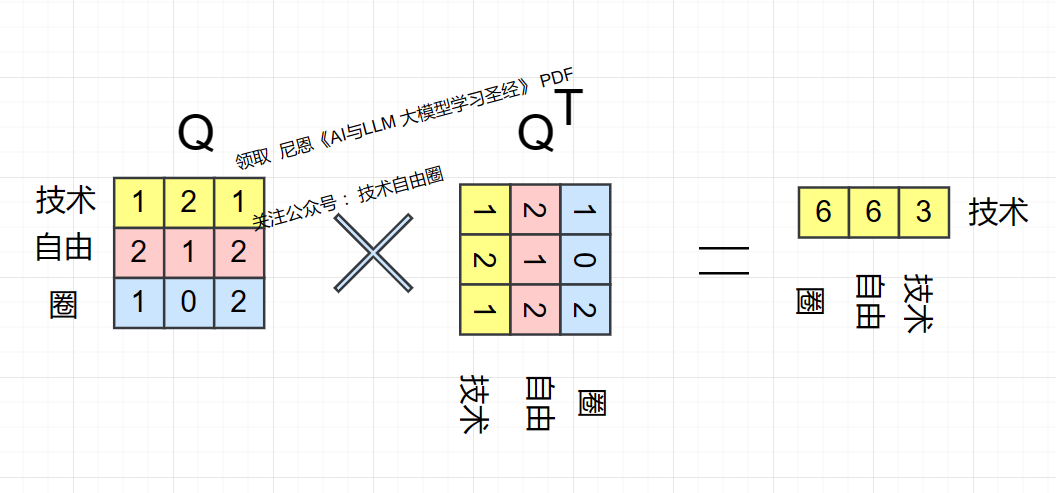 因为两个向量的内积是两个向量的相关度,那矩阵计算就是 每一纬向量和其他纬向量的相关性, 在上图中,也就是技术 和 技术、技术和自由、技术和圈 这三个分词的相关性。 第二步,计算 分词 自由 的相关性(包括自己和自己), 计算之后得到的,是 自由 和 技术、自由和自由、自由和圈 三个分词 之间的 相关性:
