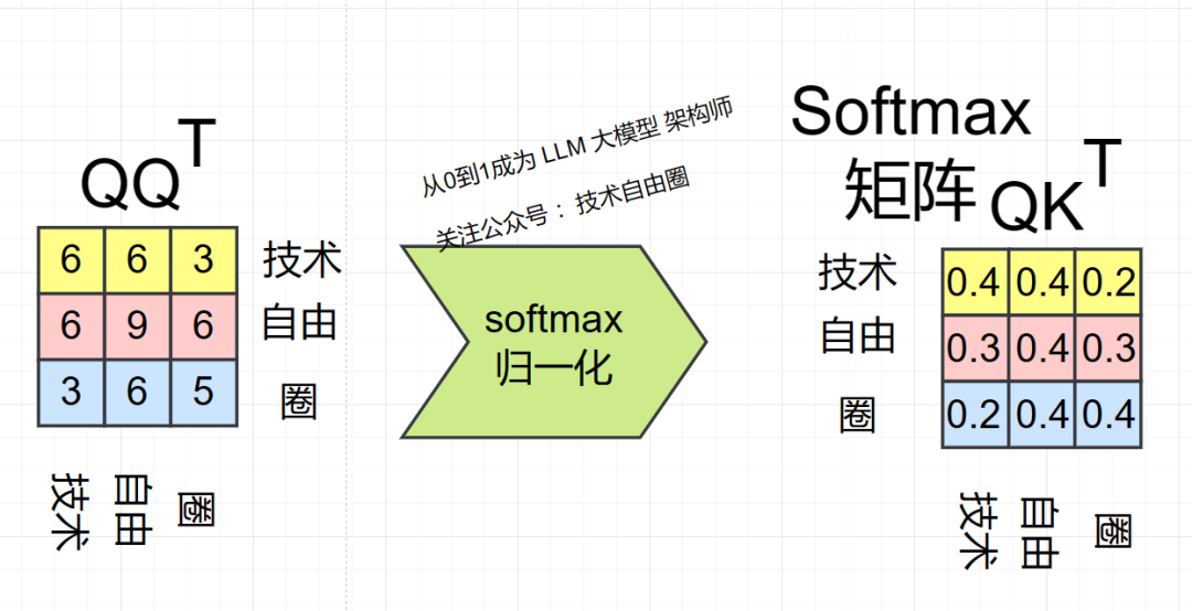 当然是为了提升模型的拟合能力,矩阵 WQ,WK,WV 都是可以训练的,起到一个缓冲的效果。 40岁老架构师尼恩提示:大模型比较难,功力浅的不容易懂。 这部分内容如果不懂,可以稍后去学习技术自由圈社群对应的配套视频《从0到1穿透LLM大模型架构》,具体请参见尼恩的公号,技术自由圈 Q、K相关度原始值、相似度矩阵计算 得到矩阵 Q, K, V之后,就可以计算出 Self-Attention 的输出了,计算的公式如下: 矩阵的转置是将矩阵的行和列对调的操作,即将原矩阵的第i行转换为转置矩阵的第i列,将原矩阵的第j列转换为转置矩阵的第j行。在数学符号中,如果原矩阵为A,转置矩阵为A^T。 转置操作通常表示为A[i][j] = A^T[j][i]。例如, Q 乘以K 的转置后,得到的矩阵行列数都为 n,n 为句子分词数,这个矩阵可以表示分词之间的 attention 强度。