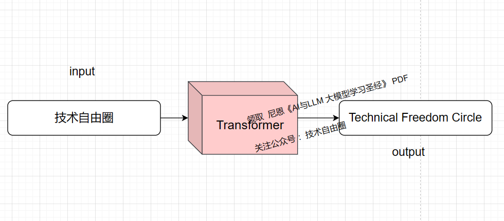 中文 "技术自由圈"的翻译,可以是 "Technical Freedom Circle" 那么,Transformer 怎么进行这种翻译呢?下图是 Transformer 用于中英文翻译的整体结构: