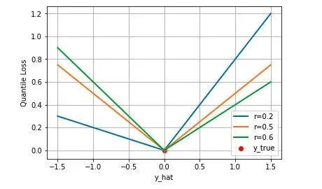 下图是取不同的分位点 0.2、0.5、0.6 得到的三个不同的分位损失函数的可视化,可以看到 0.2 和 0.6 在高估和低估两种情况下损失是不同的,而 0.5 实际上就是 MAE。