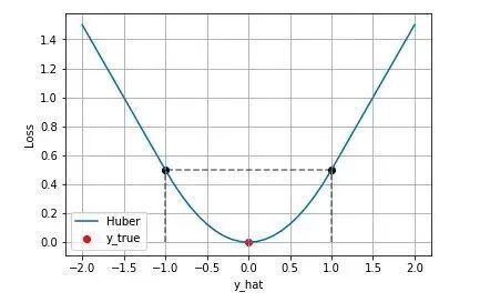 下图是 时的 Huber Loss,可以看到在 的区间内实际上就是 MSE 损失,在 和 区间内为 MAE损失。