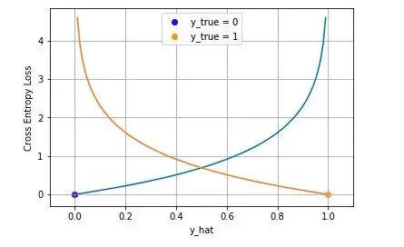 下图是对二分类的交叉熵损失函数的可视化,蓝线是目标值为 0 时输出不同输出的损失,黄线是目标值为 1 时的损失。可以看到约接近目标值损失越小,随着误差变差,损失呈指数增长。