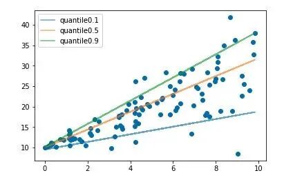 分位数回归 Quantile Regression 是一类在实际应用中非常有用的回归算法,通常的回归算法是拟合目标值的期望或者中位数,而分位数回归可以通过给定不同的分位点,拟合目标值的不同分位数。例如我们可以分别拟合出多个分位点,得到一个置信区间,如下图所示(图片来自笔者的一个分位数回归代码 demo Quantile Regression Demo)