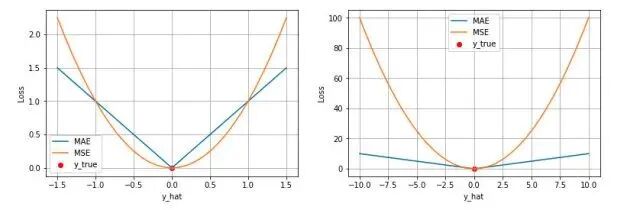 MAE 和 MSE 作为损失函数的主要区别是:MSE 损失相比 MAE 通常可以更快地收敛,但 MAE 损失对于 outlier 更加健壮,即更加不易受到 outlier 影响。