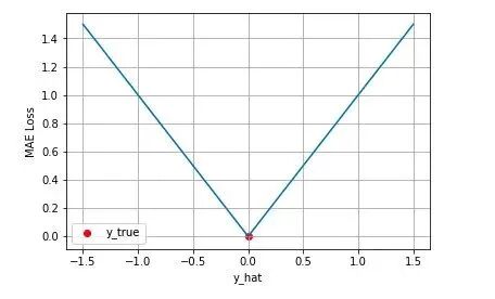 同样的我们可以对这个损失函数进行可视化如下图,MAE 损失的最小值为 0(当预测等于真实值时),最大值为无穷大。可以看到随着预测与真实值绝对误差 的增加,MAE 损失呈线性增长