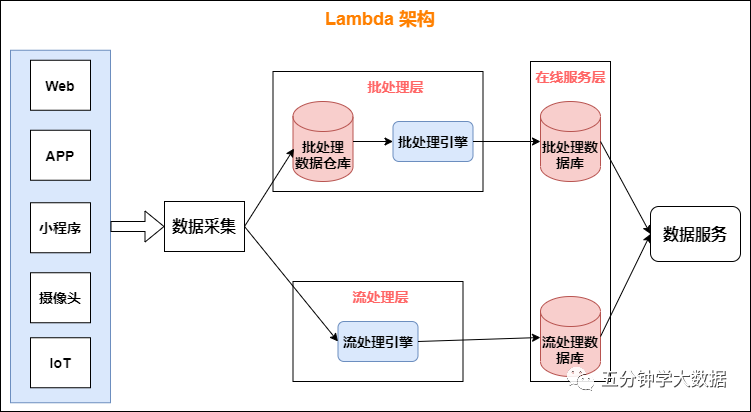 数据从底层的数据源开始,经过 Kafka、Flume 等数据组件进行收集,然后分成两条线进行计算:
