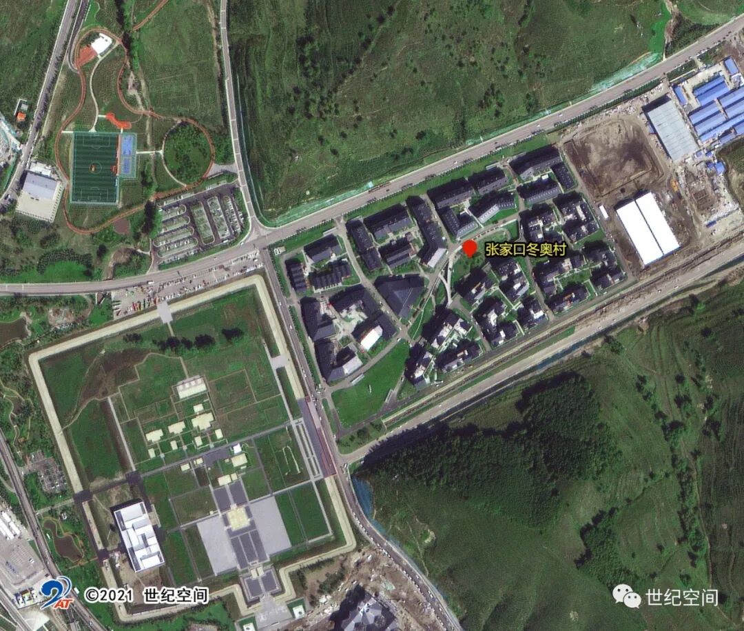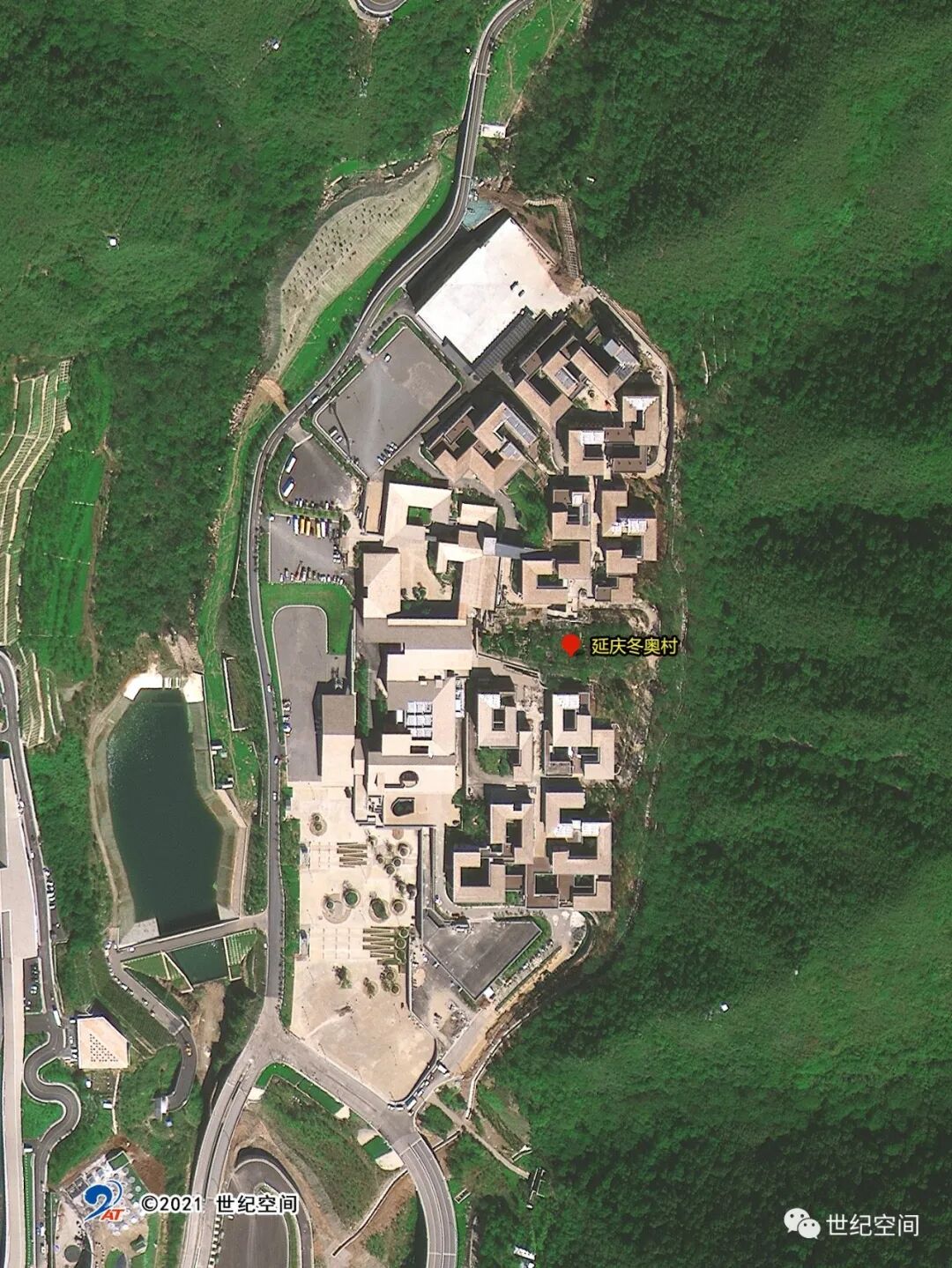 延庆冬奥村位于小海陀山脚下,采用低层、高密度的“山村”式建筑布局,半开放式建筑庭院依山而建,既展现北京四合院的文化特色,又不破山型、不夺山景。延庆冬奥村在2020年年底实现完工,于2021年8月达到赛事接待条件,赛后作为休闲度假酒店向社会开放。该影像为北京三号卫星A星于2021年9月22日拍摄。