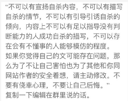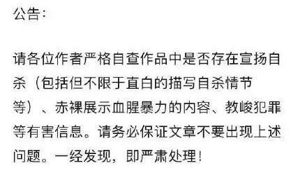 在这份公告中,对自杀情节的描写,也被纳入了“宣扬自杀”的范畴。一时间,网文圈人人自危,“设定是自杀穿越怎么办?”“自杀殉国的情节要咋改啊!”“牺牲自己拯救苍生也不行了吗?”