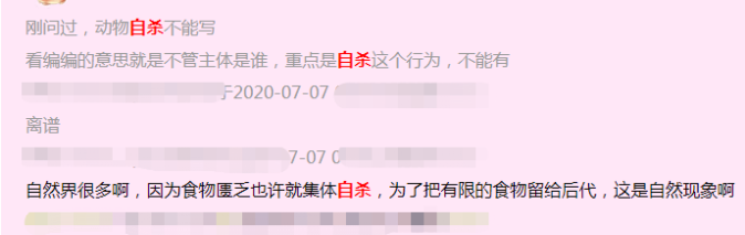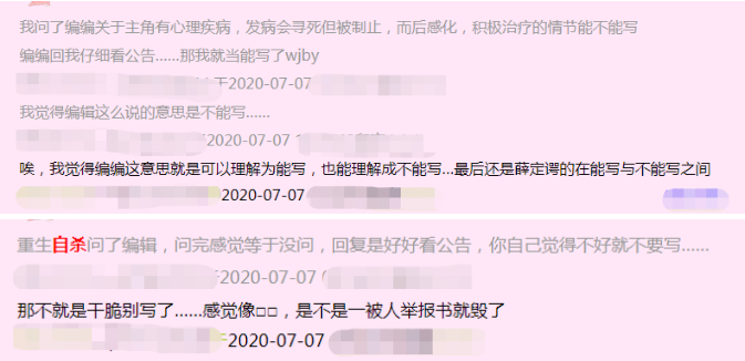 晋江内部编辑对这一规定的理解,似乎也各有不同,有的不肯给个准话,有的让作者自己掂量,有的则直言“不能写”。一位作者发帖称,询问编辑得到回复,连动物自杀也不能写。