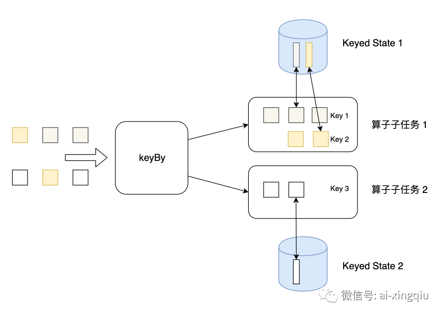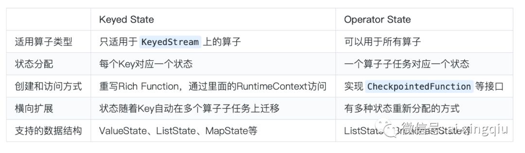对Managed State继续细分,它又有两种类型:Keyed State和Operator State。这里先简单对比两种状态,后续还将展示具体的使用方法。