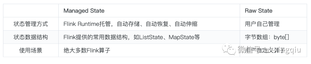 Flink有两种基本类型的状态:托管状态(Managed State)和原生状态(Raw State)。从名称中也能读出两者的区别:Managed State是由Flink管理的,Flink帮忙存储、恢复和优化,Raw State是开发者自己管理的,需要自己序列化。