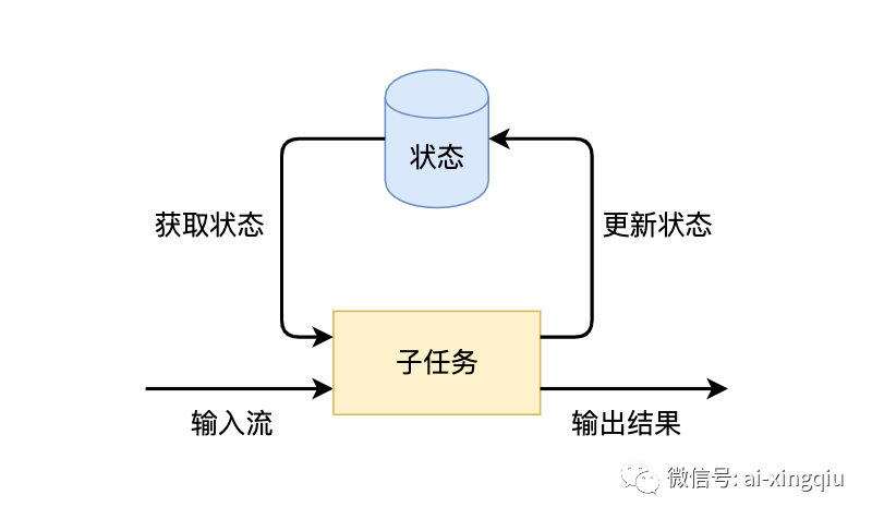 我们知道,Flink的一个算子有多个子任务,每个子任务分布在不同实例上,我们可以把状态理解为某个算子子任务在其当前实例上的一个变量,变量记录了数据流的历史信息。当新数据流入时,我们可以结合历史信息来进行计算。实际上,Flink的状态是由算子的子任务来创建和管理的。一个状态更新和获取的流程如下图所示,一个算子子任务接收输入流,获取对应的状态,根据新的计算结果更新状态。一个简单的例子是对一个时间窗口内输入流的某个整数字段求和,那么当算子子任务接收到新元素时,会获取已经存储在状态中的数值,然后将当前输入加到状态上,并将状态数据更新。