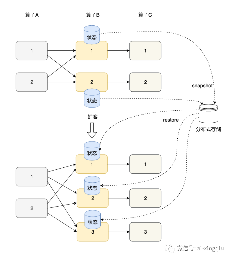 状态的横向扩展问题主要是指修改Flink应用的并行度,确切的说,每个算子的并行实例数或算子子任务数发生了变化,应用需要关停或启动一些算子子任务,某份在原来某个算子子任务上的状态数据需要平滑更新到新的算子子任务上。其实,Flink的Checkpoint就是一个非常好的在各算子间迁移状态数据的机制。算子的本地状态将数据生成快照(snapshot),保存到分布式存储(如HDFS)上。横向伸缩后,算子子任务个数变化,子任务重启,相应的状态从分布式存储上重建(restore)。