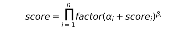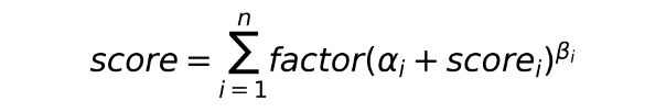 其中,αi:超参,灵敏度;scorei: 模型i的输出;βi:超参,提升比例,非线性处理;factor:超参,组合权重;n:模型数量。