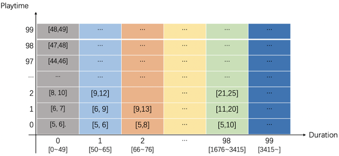 采用等频分桶的方式,对一定时间窗口内的播放样本按照duration(视频时长)排序分散到100个桶,确保同一桶中视频观看数相同。进一步地对每个duration桶按照playtime(播放时长)排序再次等频分散到100个桶,并将权重归一化到[0,99]的区间整数。因此对所有样本,均可按照(duration,playtime)确定固定的分桶坐标和权值。