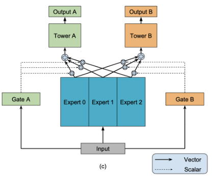 MMOE模型底层通过采用Soft parameter sharing方式,能够有效解决两个任务相关性较差情况下的多任务学习。