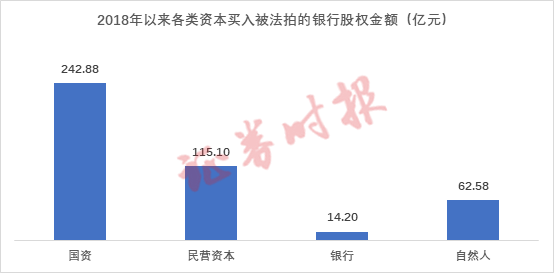 证券时报记者统计,在2018年之后法拍成交的银行股权中,国有资本买入243亿元,占比约55%;民营资本买入115亿元,占比约26%;自然人股东买入63亿元,占比约14.4%。这一数据从侧面反映出,中小银行的股权结构正在发生变化(图2)。