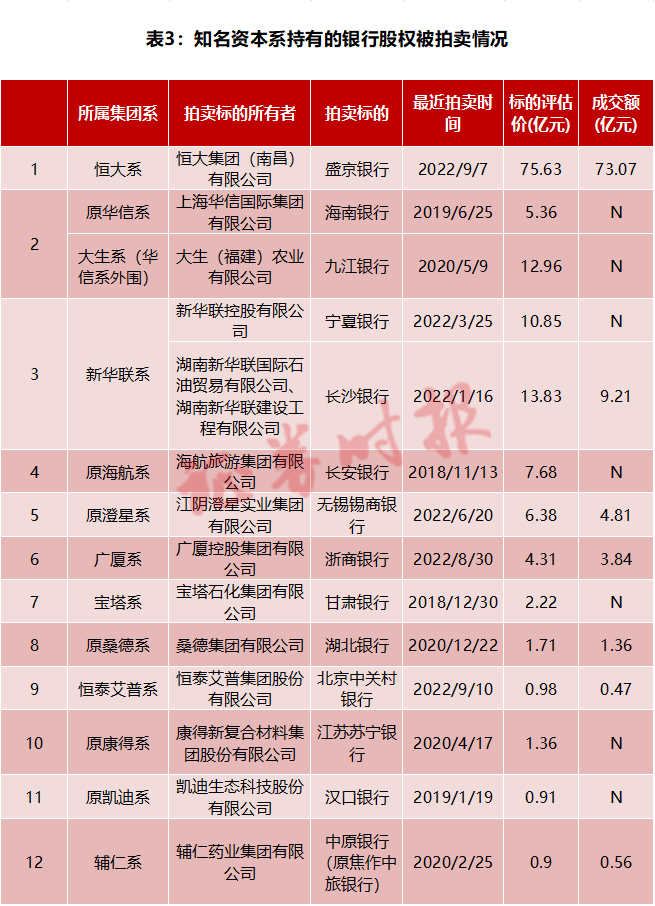 今年9月以来,已有盛京银行、泰安银行、浙商银行等多笔亿元级别的银行股权被执行司法拍卖。其中,恒大集团所持盛京银行12.82亿股股份被沈阳国资联合四家民企以73.07亿元接盘,创下银行股权在线上司法拍卖的最高金额成交记录。