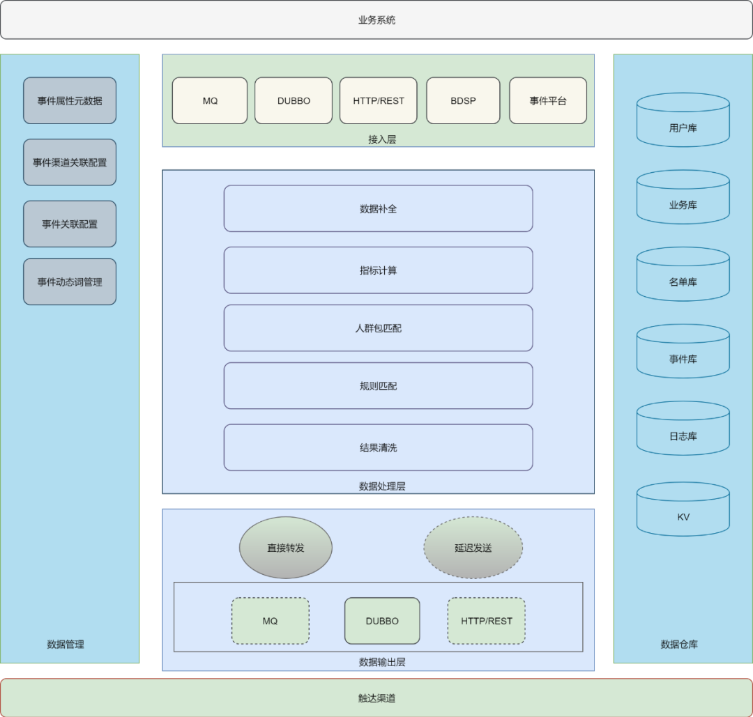 渠道触达服务:全渠道触点的聚合服务层,对接包括短信、push、微信等外部触点服务的发送、数据回收接口。处理流程:准备投放物料、用户寻址、进行防骚扰频控,最终触达用户。