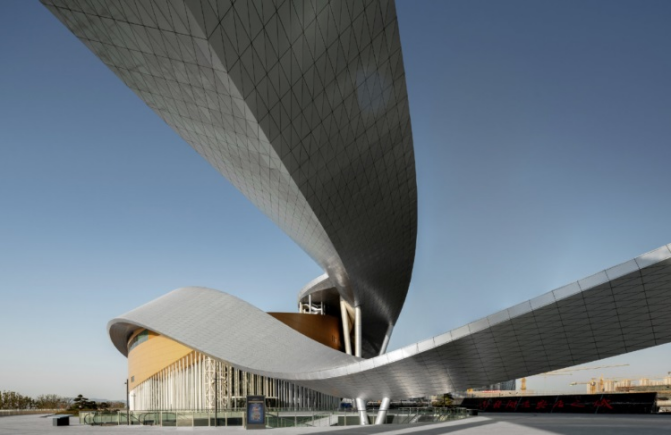 江苏苏州湾文化中心入选第二名,在建筑业界形成了不小争议。该项目位于苏州吴江太湖东岸,由普利兹克奖得主、国际著名建筑师克里斯蒂安·德·包赞巴克(Christian de Portzamparc)设计。项目以“飘带”作为主要设计概念和标志性形象,高低两条巨型钢结构飘带在空中交织,难度颇高且造价不菲,建筑高位飘带最大跨度达100米。