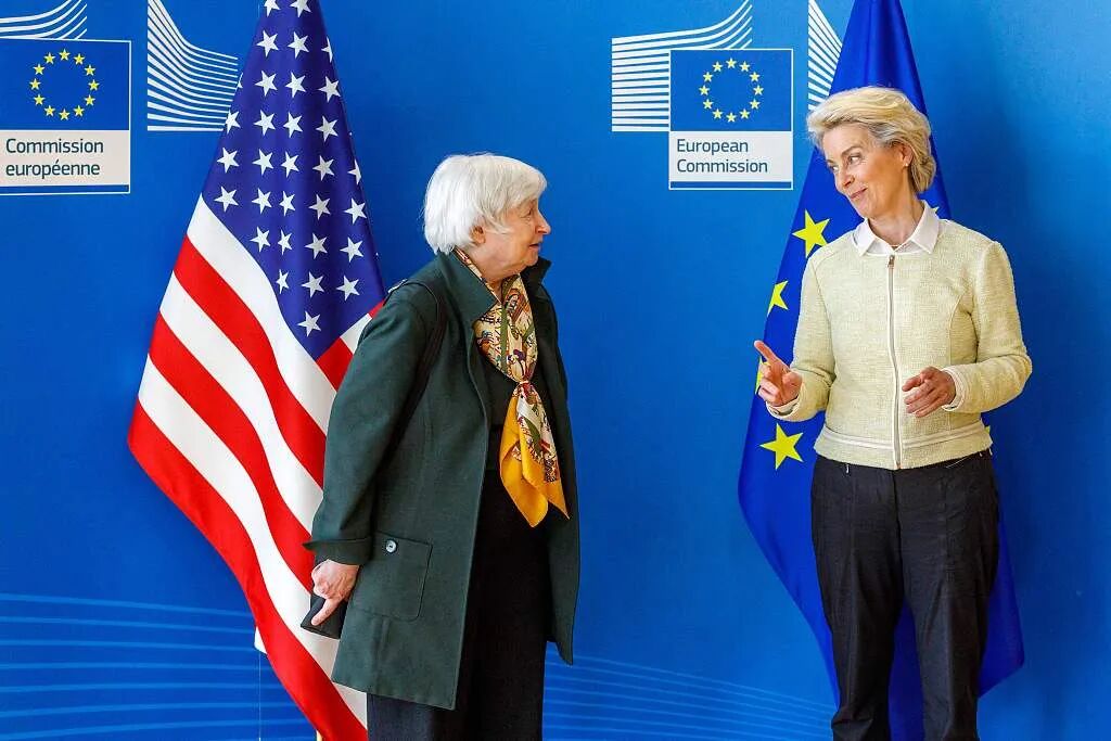 5月17日,欧盟委员会主席冯德莱恩(右)在布鲁塞尔会见美国财政部长耶伦(左)。