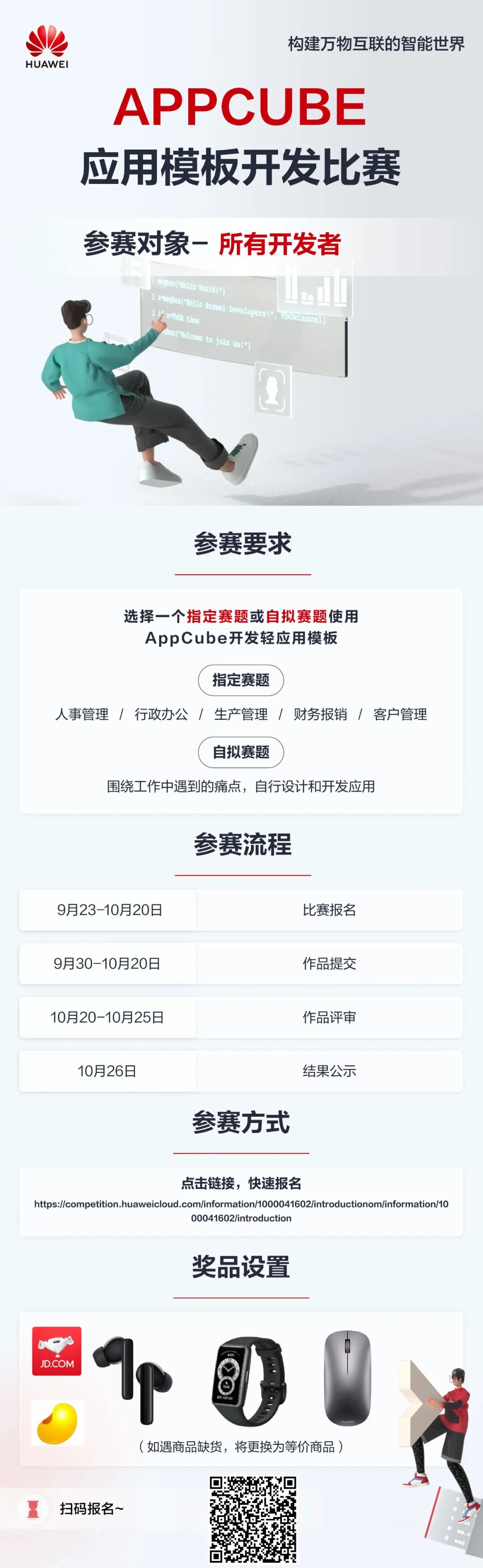 在AppCube平台中,已经预置了很多应用模板,但即便如此,也无法完全覆盖到工作中所有的应用场景。因此,我们鼓励大家发挥创造力,开发出更多的模板,提升日常使用中的便捷性,并丰富整个AppCube的应用生态。扫描海报二维码或点击底部阅读原文即可快速报名提交作品,还有好礼等你来拿喔~![]()