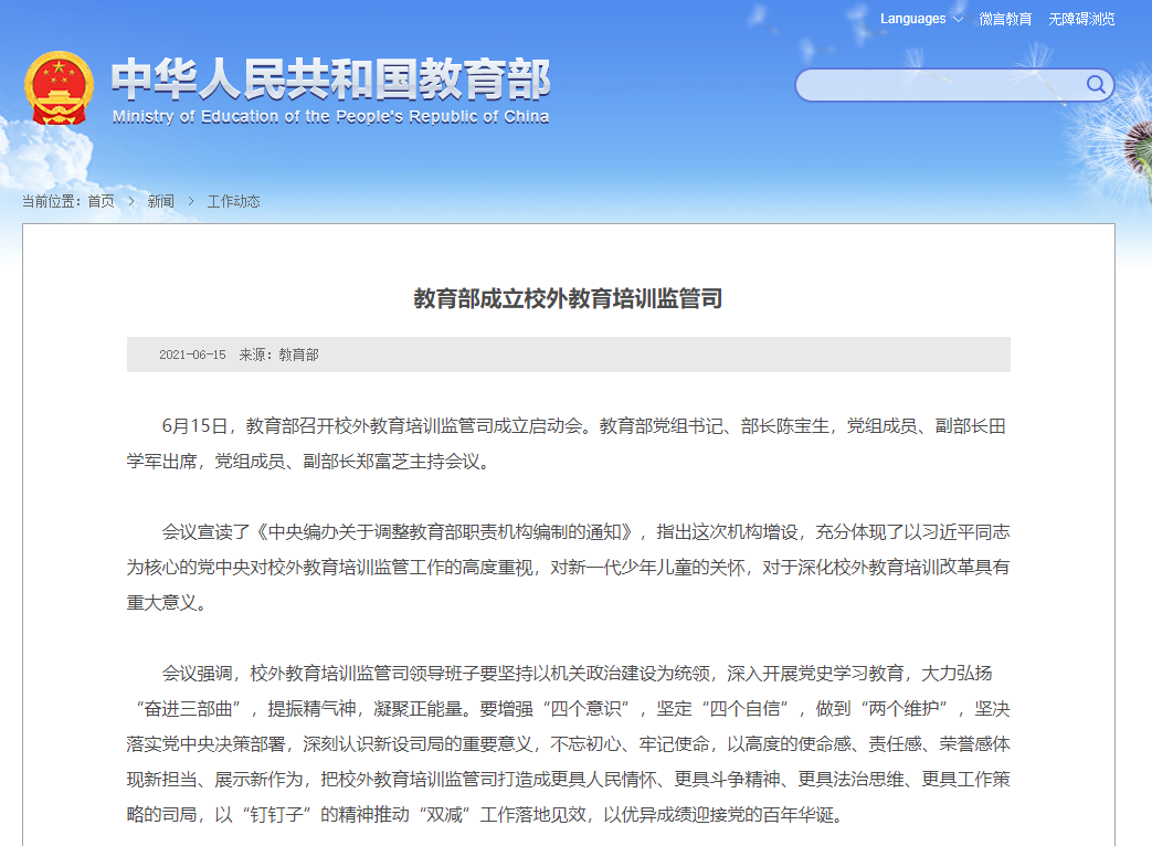 6月15日,教育部召开校外教育培训监管司成立启动会,一直乱象频出的校外教育培训将有专职部门管理。据介绍,校外教育培训监管司承担面向中小学生(含幼儿园儿童)的校外教育培训管理工作,指导校外教育培训机构党的建设,拟订校外教育培训规范管理政策。会同有关方面拟订校外教育培训(含线上线下)机构设置、培训内容、培训时间、人员资质、收费监管等相关标准和制度并监督执行,组织实施校外教育培训综合治理,指导校外教育培训综合执法。指导规范面向中小学生的社会竞赛等活动。及时反映和处理校外教育培训重大问题。