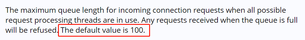maxThreads 用完了之后,进队列。队列长度(acceptCount)默认是 100: