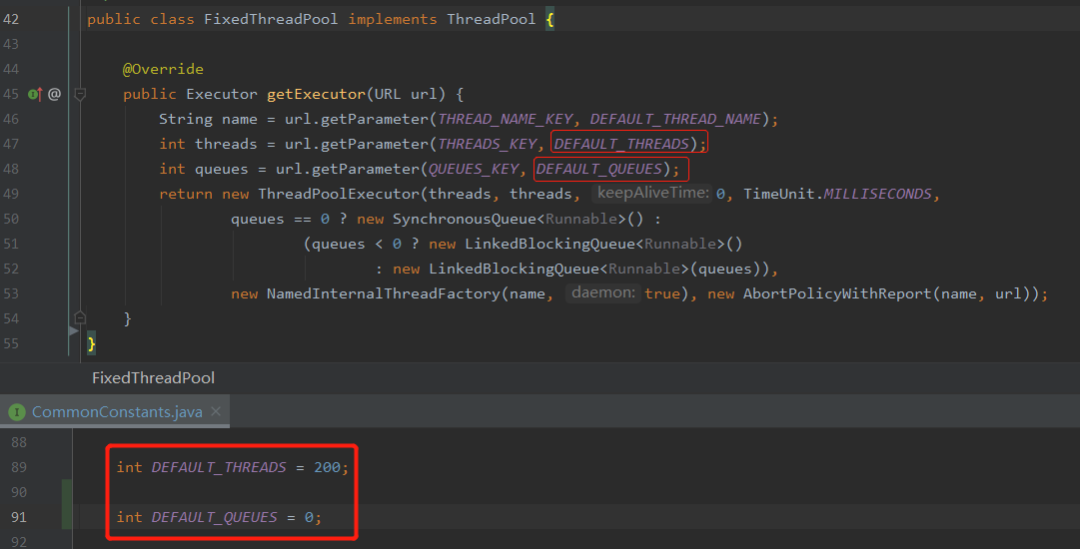 默认情况下,服务端使用的是 fixed 线程池,核心线程池数和最大线程数都是 200。队列长度默认为 0: