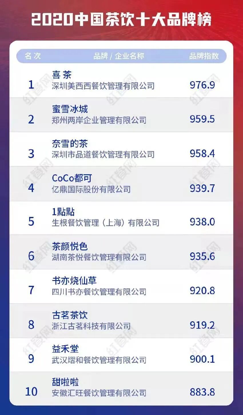 2019、2020年中国茶饮十大品牌榜上,它都位列第一。