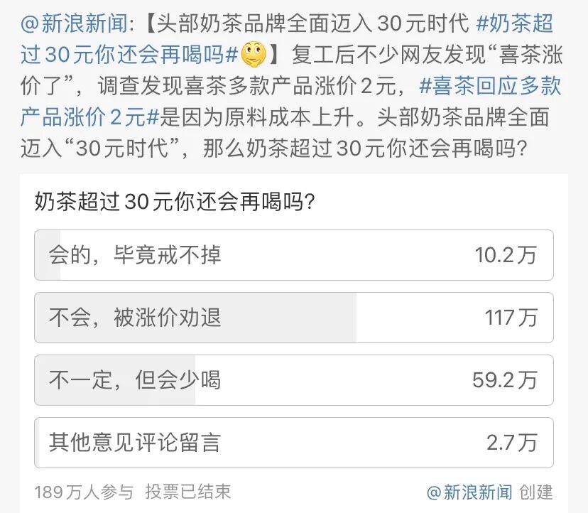 当前的奶茶市场,一线城市茶饮已经相对饱和,下沉成为新趋势。很多人不一定愿意为了随着高成本而来的高定价买单,前段时间喜茶涨价,微博相关投票中,