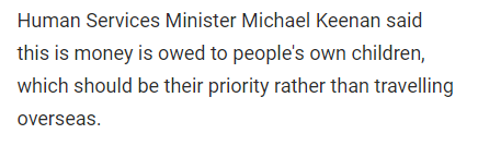 民政服务部长Michael Keenan说,这是欠人民自己孩子的钱,这应该是他们的优先考虑,而不是出国旅行。