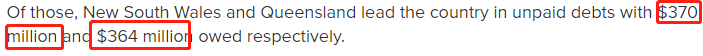其中,新南威尔士州和昆士兰州的未偿还债务领先全国,分别为3.7亿澳元和3.64亿澳元。