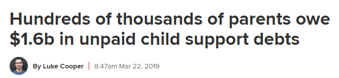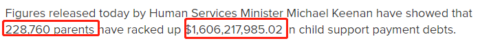 人类服务部长Michael Keenan今天公布的数据显示,228,760名父母已经欠下了1,606,217,985.02澳元的子女抚养费债务。