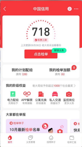 如下图所示,这张图片看上去像是一个叫“中国信用”的APP页面截图,上面有一个分数,下面配上了所谓“权贵三级”的称号。更耸人听闻的是,这个APP还设置了“检举告密加分”、“监控”这种字眼。