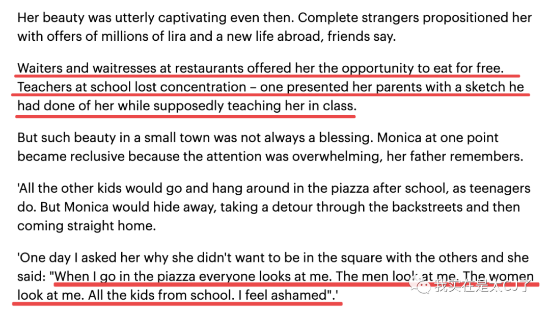 陌生人主动提出要给她一大笔钱让她去国外生活,出去吃饭也会因为太漂亮而被免单,老师在上课时会偷偷给她画素描肖像……因为所有人都盯着她看个没完,莫妮卡·贝鲁奇一度变得孤僻,甚至不想跟其他小朋友一起去广场玩耍。