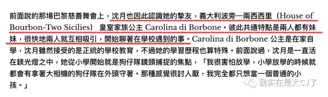 然后沈月才说起自己和公主挚友的最大不同,是Carolina di Borbone在家自学成才,而沈月却从小学开始就被狗仔队围追堵截。