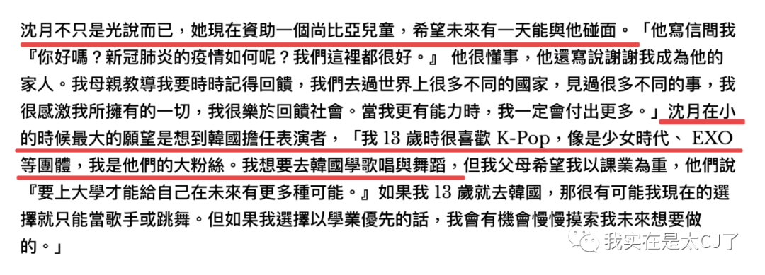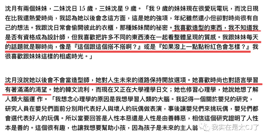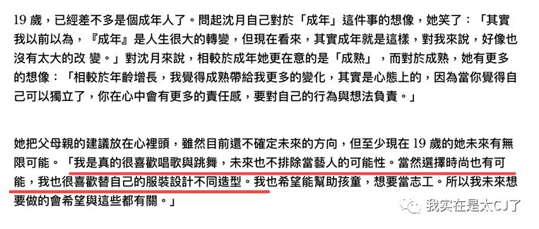 比如在讲完沈月有多恋家、邱淑贞也意外出现在摄影棚指导女儿拍照摆pose之后,文章又进行到“She has a dream”的部分,但沈月说她不确定自己能不能做造型师,因为对未来持开放态度。