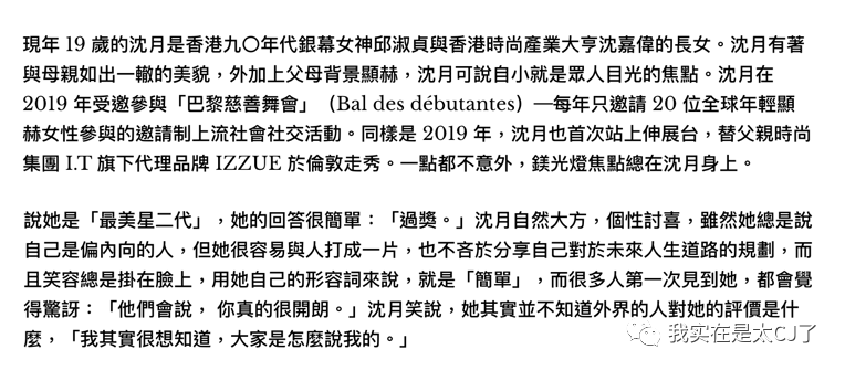 在讲到被排挤的事情之前,文章先花了两三段去写沈月如何为家里代理的品牌走秀,以及当初参加“每年只邀请20位年轻显赫女性”那场巴黎慈善舞会之于自己的重要意义——