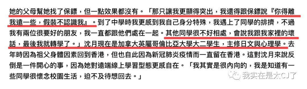 即使父母找了保镖也无济于事,后来上中学了,同学们还会跟沈月说她家里的坏话,于是沈月选择转学。