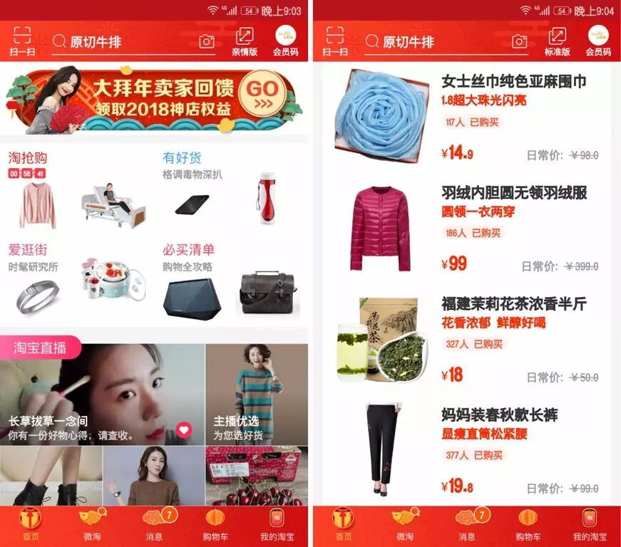 Left: normal Taobao homepage, smaller text, and more complex design