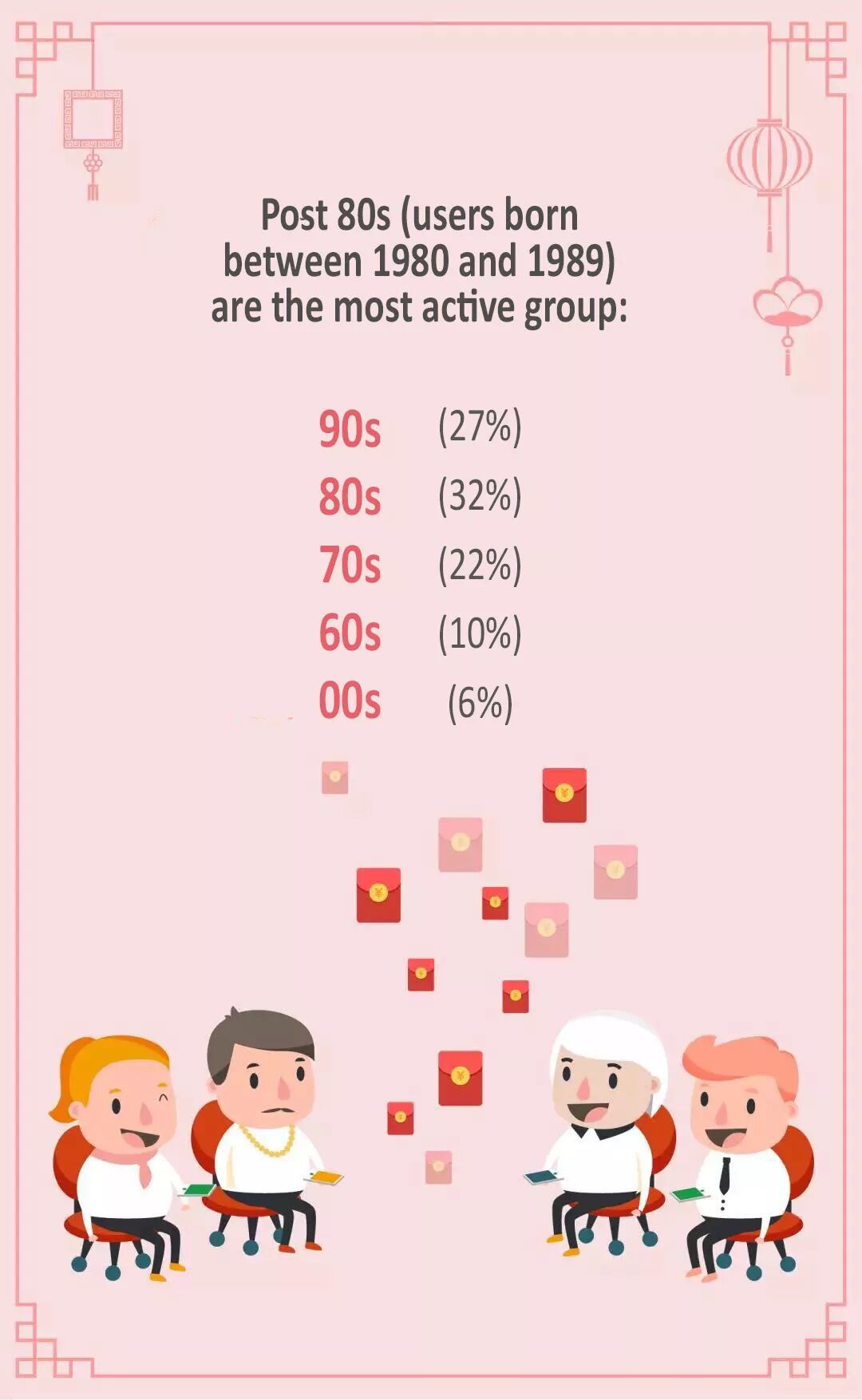 The post-80s generation accounted for 32% of the red-envelope users.