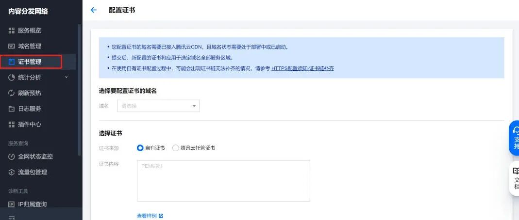 在申请证书后,需要按照指引配置对应的dns解析或在用户源站放置CA要求的文件以供CA校验,验证通过后,就可以获取到对应的证书和私钥。在腾讯云cdn控制台的证书管理页面可以配置 HTTPS。支持单个域名或批量部署证书,用户可以自己上传要配置的证书,或者先将证书托管在腾讯云上,然后再部署到CDN控制台。